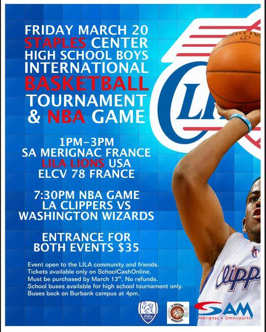 Pour la 3ème année consécutive, une équipe de l'ELCV s'envole pour Los Angeles pour une grosse semaine magique organisée par le LILA, le Lycée International de L.A. Le point d'orgue sera encore un match au Staples Center, en ouverture d'un match de NBA des Clippers, qui accueilleront les Washington Wizards de Kevin Seraphin, le match des 5èmes de chaque conférence.