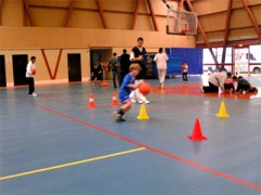 La salle est comble, il y a environ 60 participants qui se succèdent entre 14h et 18h. Cinq stands ont été mis en place : Adresse, Dribbles, Lancer francs, Détente, 1 contre 1.